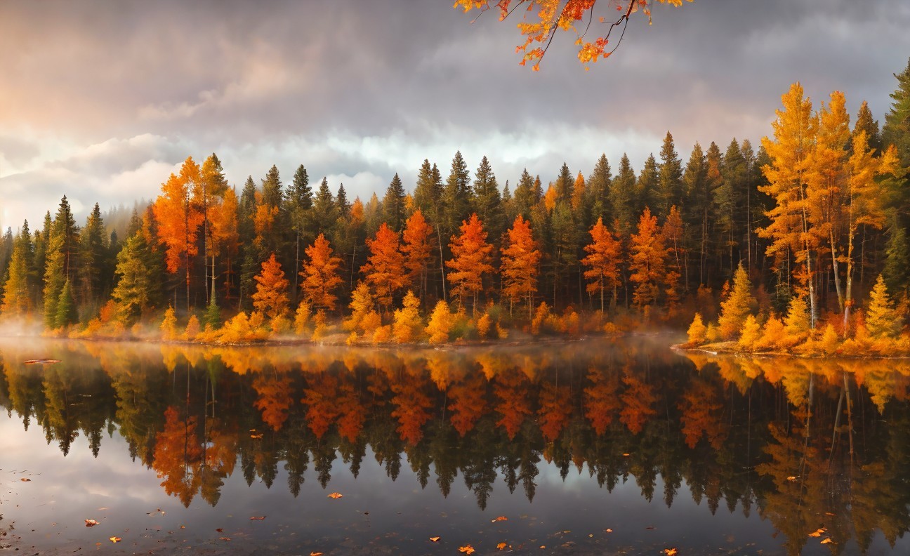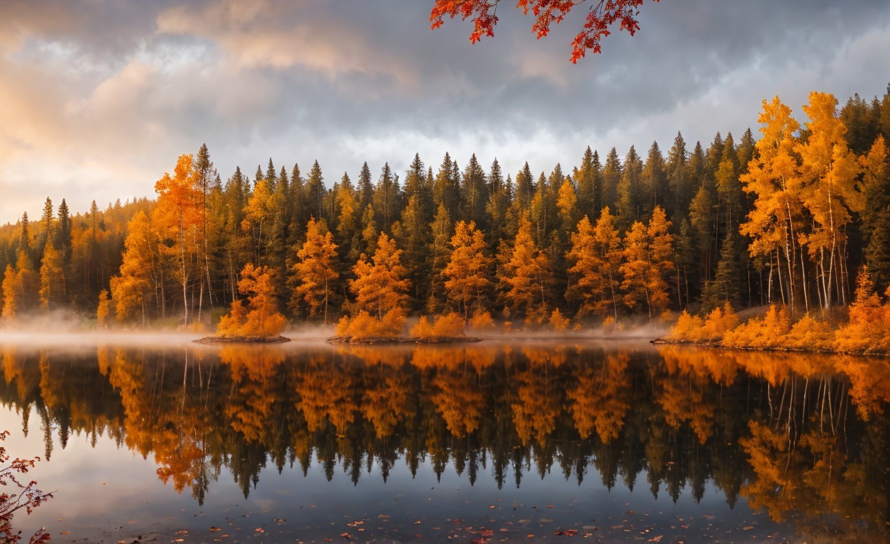 Vibrant autumn foliage, Finnish forest, tall spruce trees, golden birches, crimson maples, fallen leaves carpeting the ground, tranquil lake reflecting colors, misty morning atmosphere, cozy wooden cabin, traditional Finnish sauna, warm color palette of reds, oranges, yellows, greens, and browns, soft natural lighting, realistic digital painting, detailed textures, by Ivan Shishkin and Akseli Gallen-Kallela, ArtStation.
