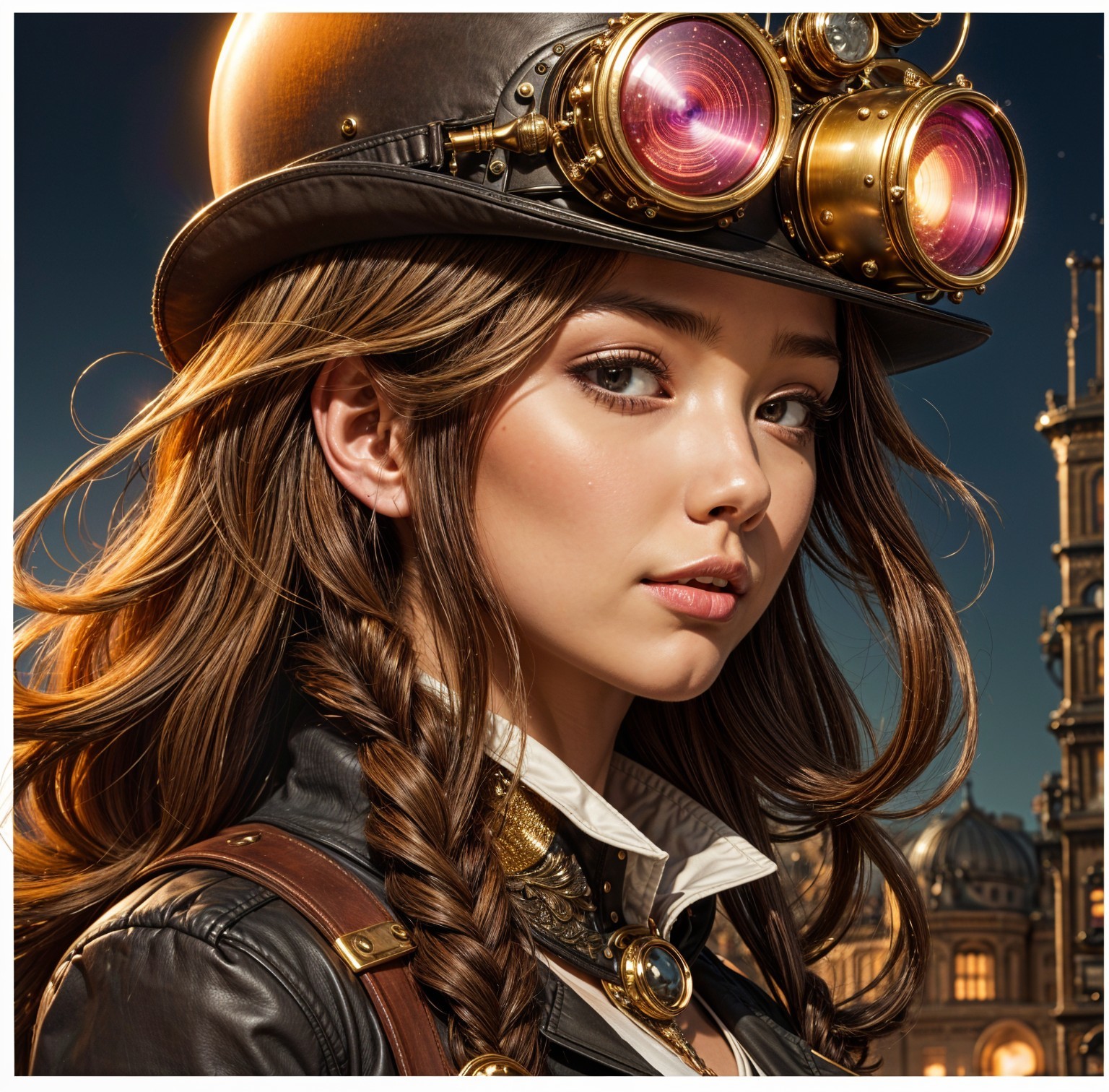 A young woman with flowing hair wears a stylish steampunk hat adorned with gears and a clock. Her confident gaze and intricate attire evoke a sense of adventure in a fantastical setting.