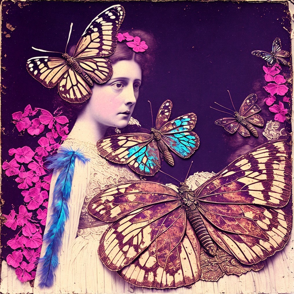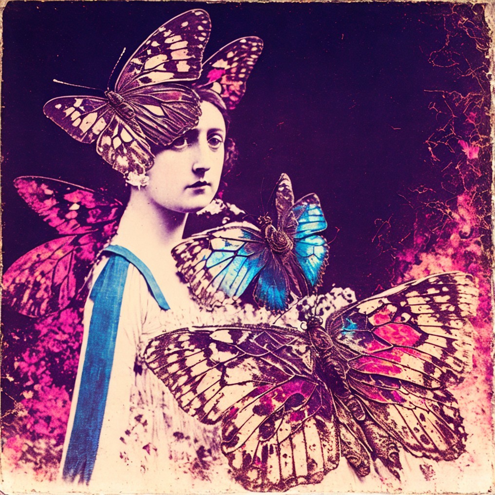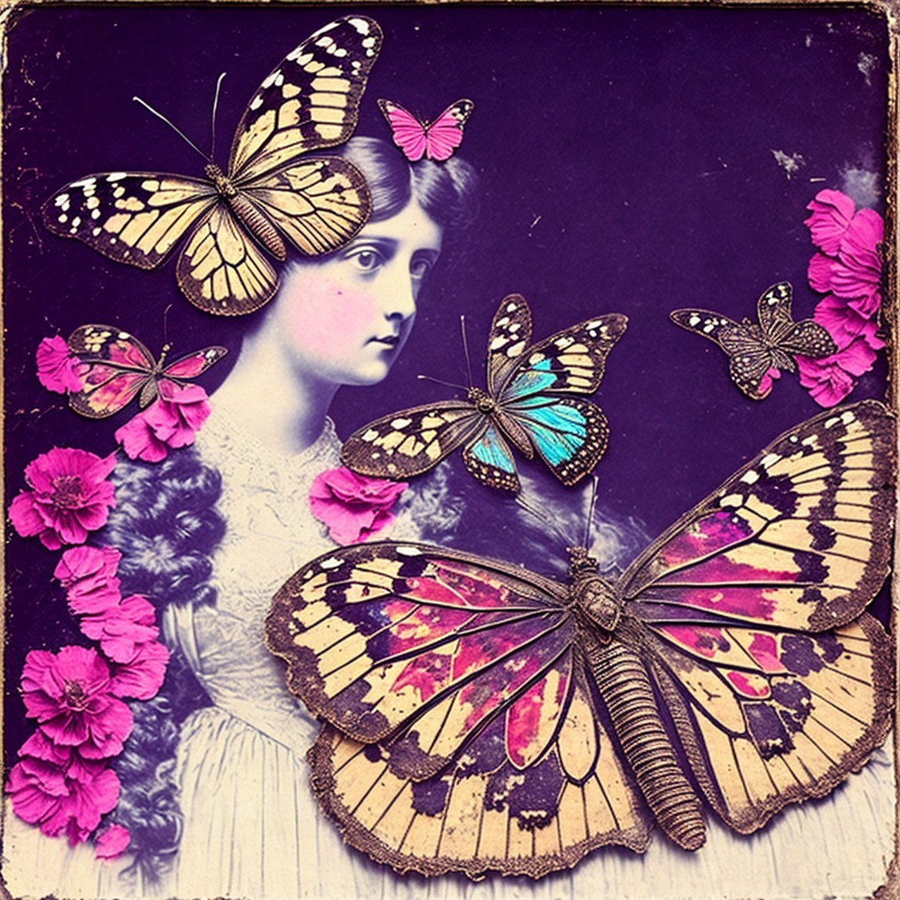 A vintage portrait of a woman with butterflies and pink flowers superimposed, creating a whimsical and artistic composition.