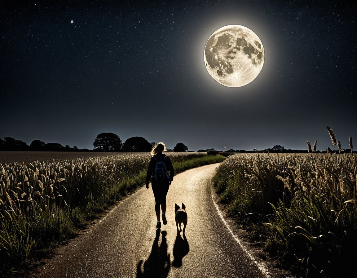 A silhouette of a person jogging with a dog along a winding road under a bright full moon, surrounded by tall grass and a starry night sky. The scene exudes tranquility and companionship.