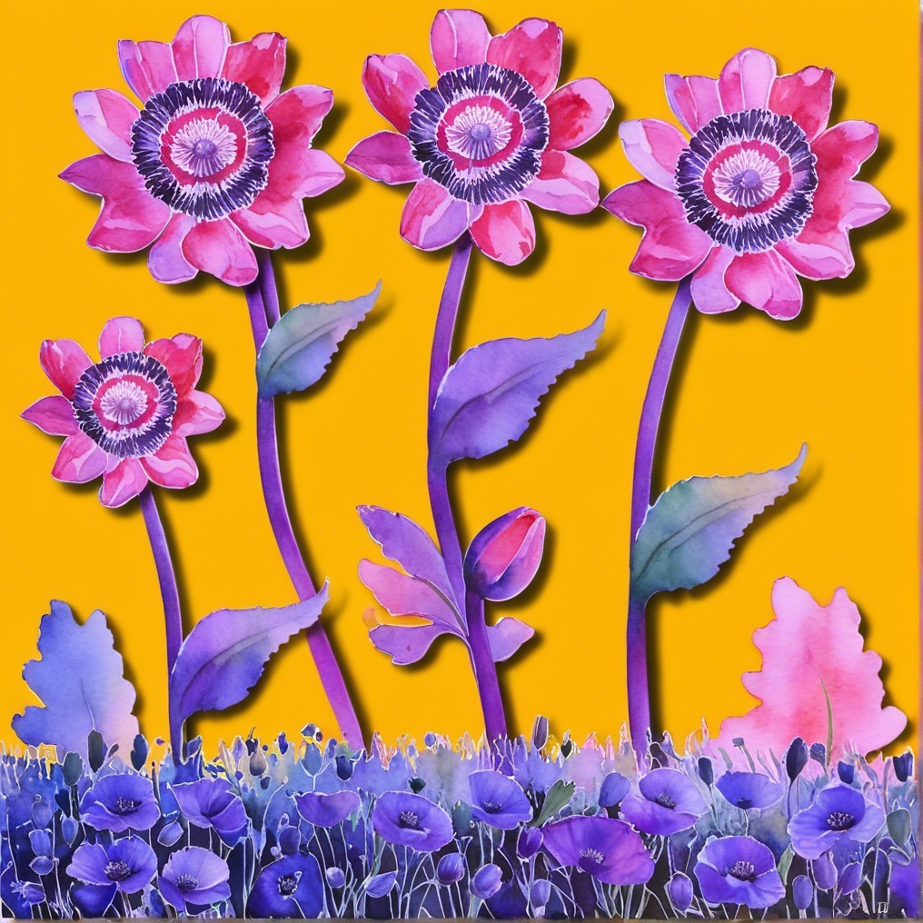 A vibrant illustration features tall, pink flowers with dark centers against a bright yellow background. Lush green leaves and smaller blue flowers add depth and contrast to the scene.