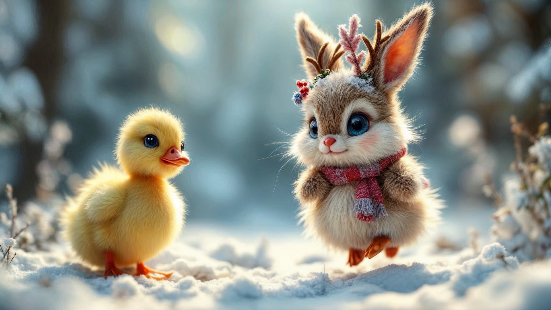 Two highly detailed, adorable, fluffy, stylized animals are shown on a snow-covered ground in a winter setting. On the left side of the image, facing right, is a bright yellow baby duck with large blue eyes and an orange beak, standing on similarly colored orange webbed feet. Its yellow