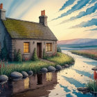 A serene scene depicts two Dalmatians, one resting atop a quaint house with a grassy roof, while the other sits in a small boat. The setting sun casts a warm glow over the calm water.