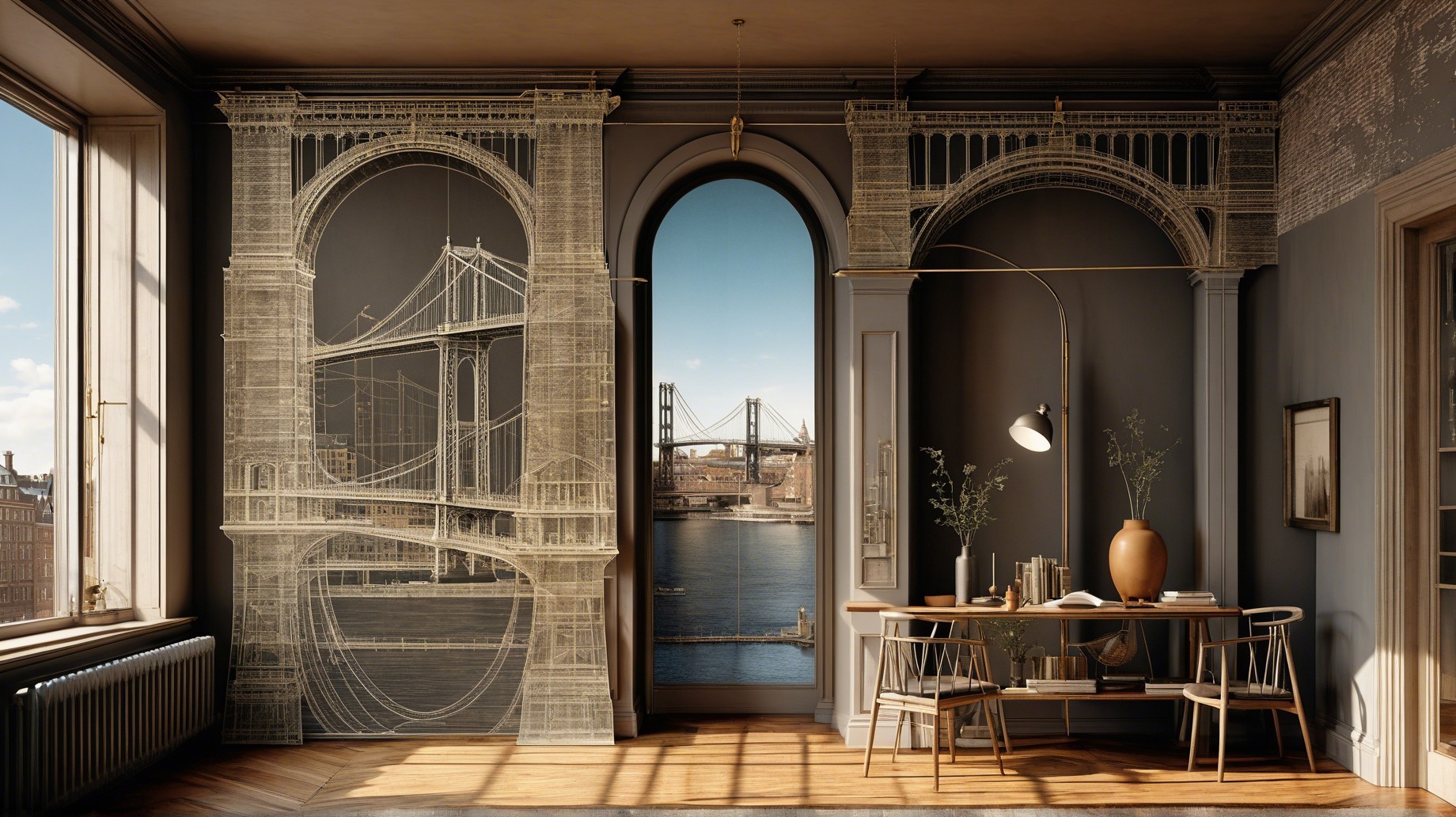 A stylish interior features a large mural of the Manhattan Bridge with architectural blueprints, complemented by a cozy sofa and natural light from large windows.