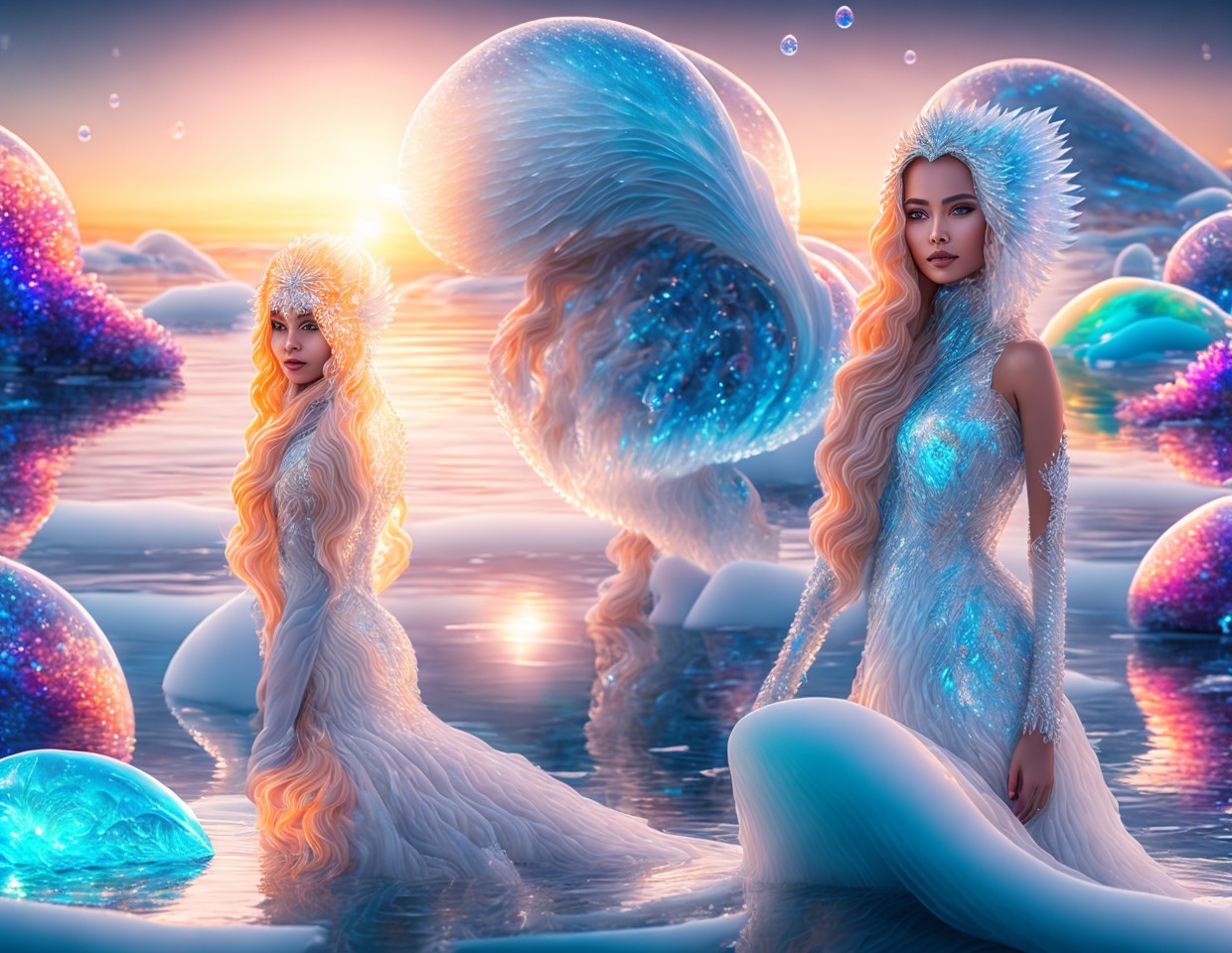 Fantasy image of three ice elementals with crystalline wings by a glacial sea with a rainbow and sunset backdrop.