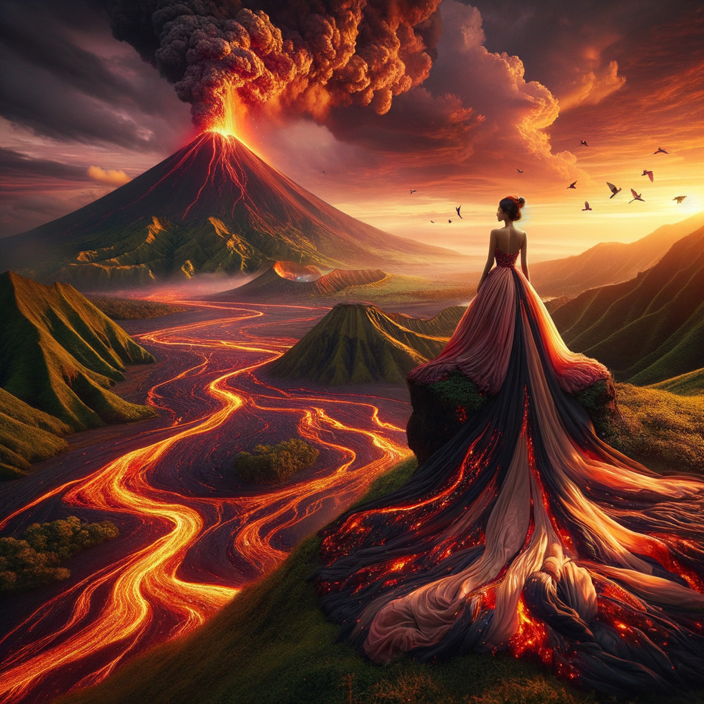 Position a little girl figure with tanned skin in the foreground on a small rock outcrop far away from the volcano. She has an elegant, flowing dress that mimics the vibrant oranges, reds, and blacks of the molten lava. The dress should swirl around her, resembling the twists and patterns of the lava flows. Her hair is styled in a simple updo, showcasing her poised profile as she gazes towards the eruption. Include a flock of birds in the sky, adding life to the scene. The overall mood is a juxtaposition of serene beauty against the dynamic power of natural forces."
