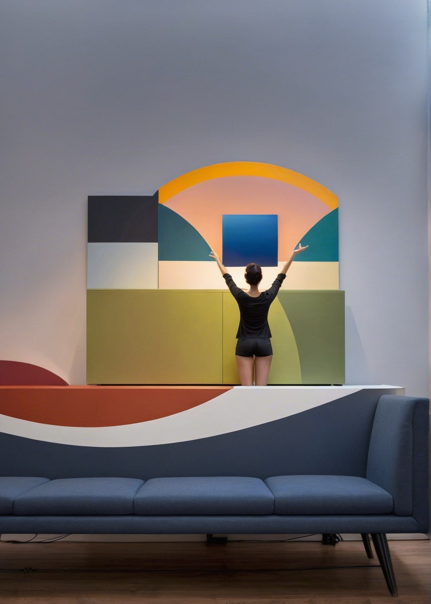 A woman in a black dress interacts with abstract art panels in a modern interior, highlighting vibrant colors against a minimalistic backdrop, complemented by a stylish gray couch.