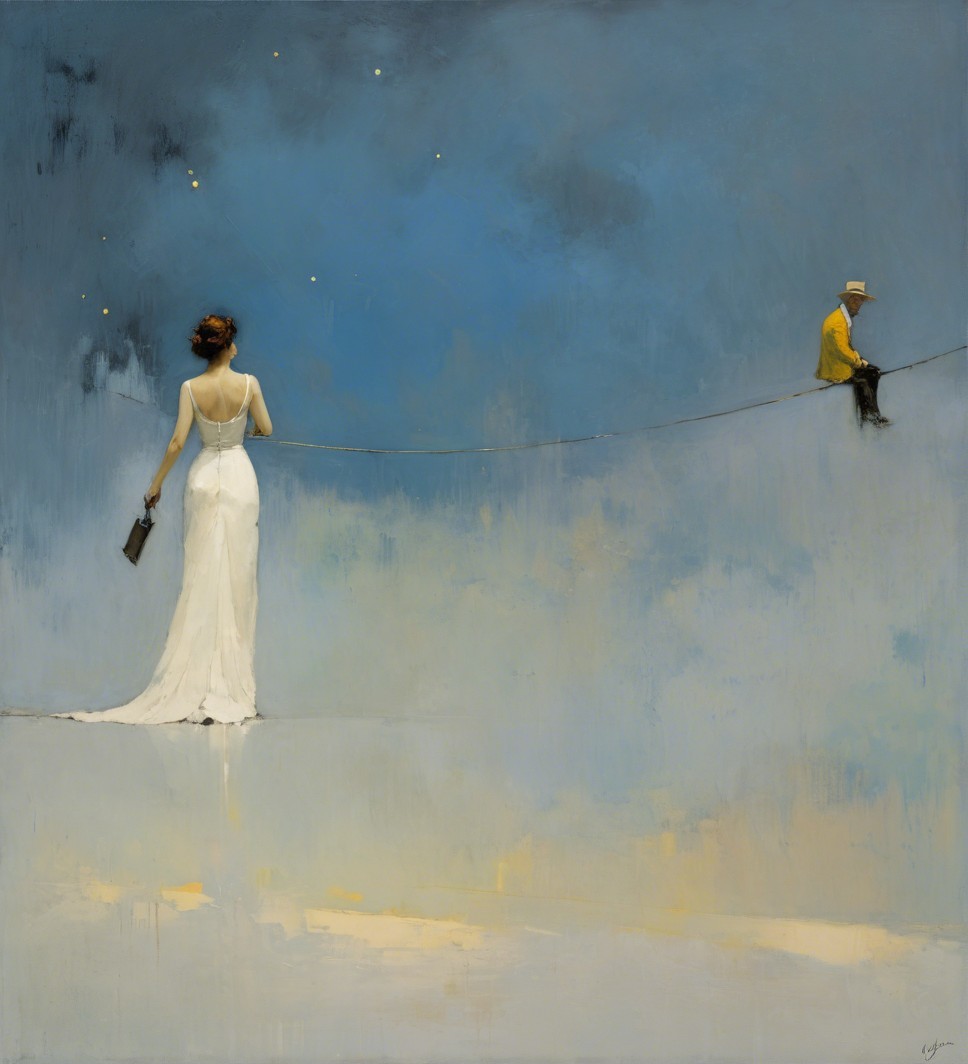 A serene scene depicts a bride in a flowing white gown holding flowers, standing on a tightrope. Nearby, a man in a yellow jacket perches casually, against a dreamy blue backdrop.