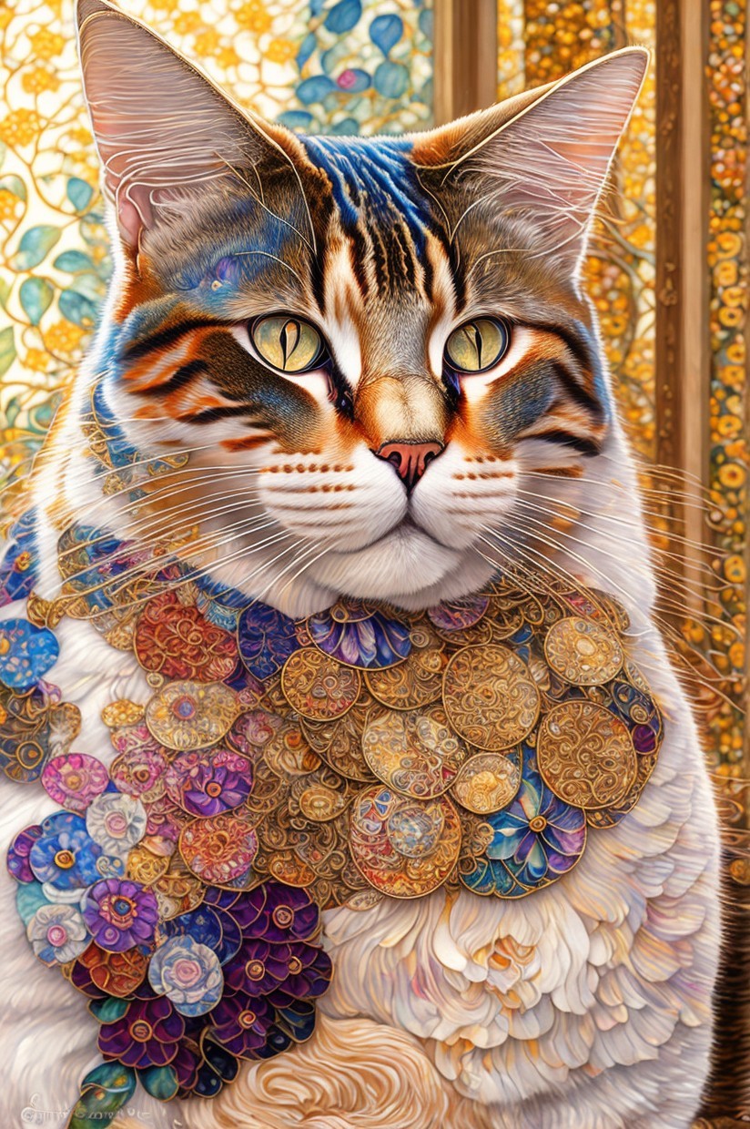 A close-up of a cat with striking green eyes, wearing a colorful floral patterned collar. The background features vibrant flowers, enhancing the cat's striking appearance and playful character.