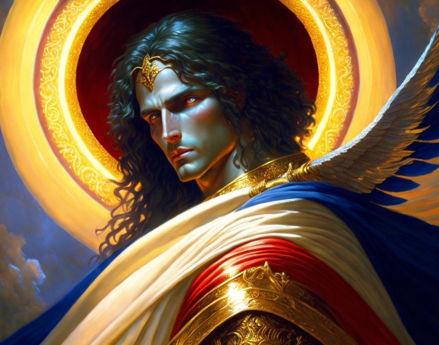 Archaengel Michael, Guardian of Light, An angelic figure with blue eyes, long brown hair, golden circlet, white wings, red and blue cloak against a radiant backdrop.
