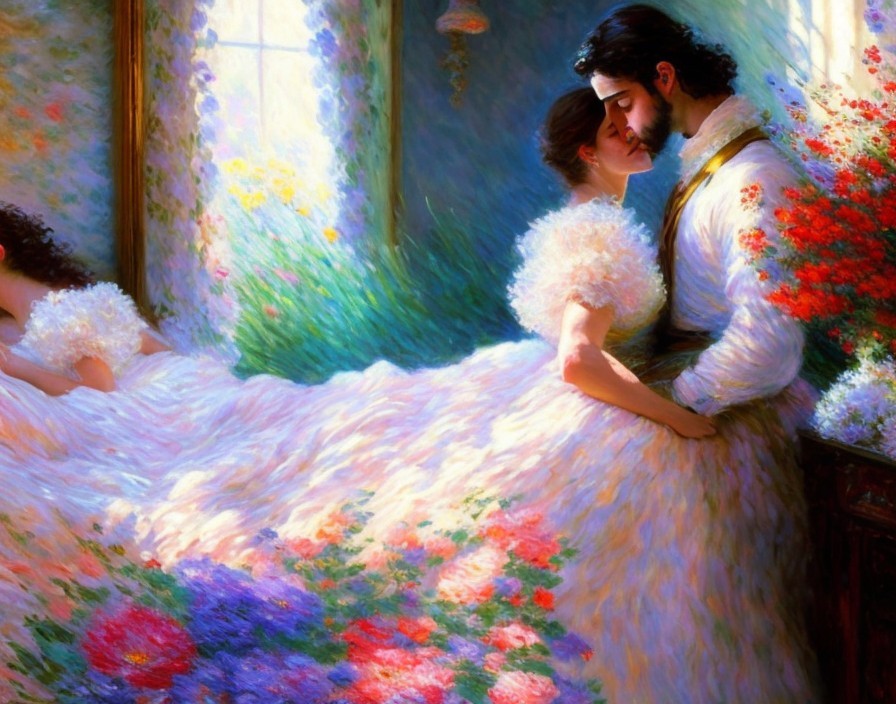 Prompt: "An impressionistic, ephemerc vision; Claude Monet style: a beautiful, very attractive and delicate dream-like couple, immersed in each other's embrace and colorful flowers, on a four-poster bed. They don't see the world outside themselves, they are so in love.