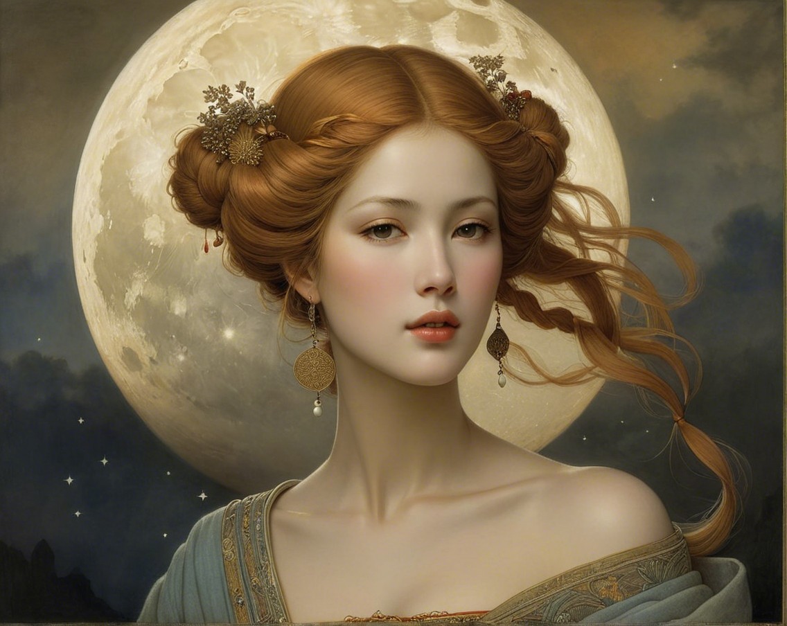 A serene woman with flowing red hair, adorned with flowers and jewelry, gazes thoughtfully against a backdrop of a large, luminous moon and soft clouds, embodying grace and beauty.