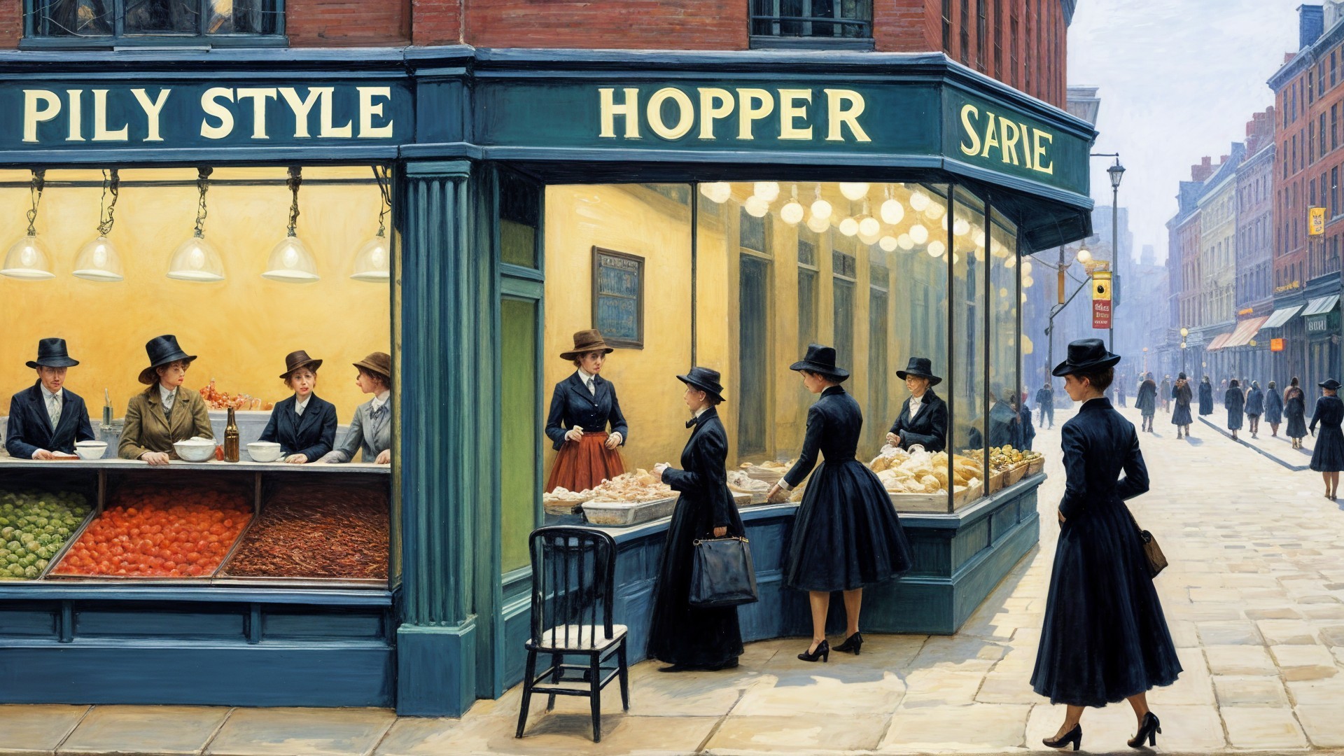 A vintage street scene showcases a fashionable woman in a dark dress and hat outside a quaint shop, while dapper gentlemen in suits converse, evoking a classic, nostalgic atmosphere.