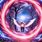 A mystical scene featuring a winged creature soaring through a vibrant, glowing portal. Surrounding trees bloom with pink blossoms under a full moon, set against stunning mountain views.