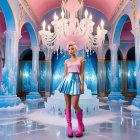 A young woman in a pastel outfit stands elegantly in a lavish room adorned with towering blue decorative fabric and a grand chandelier, creating a dreamy, whimsical atmosphere.