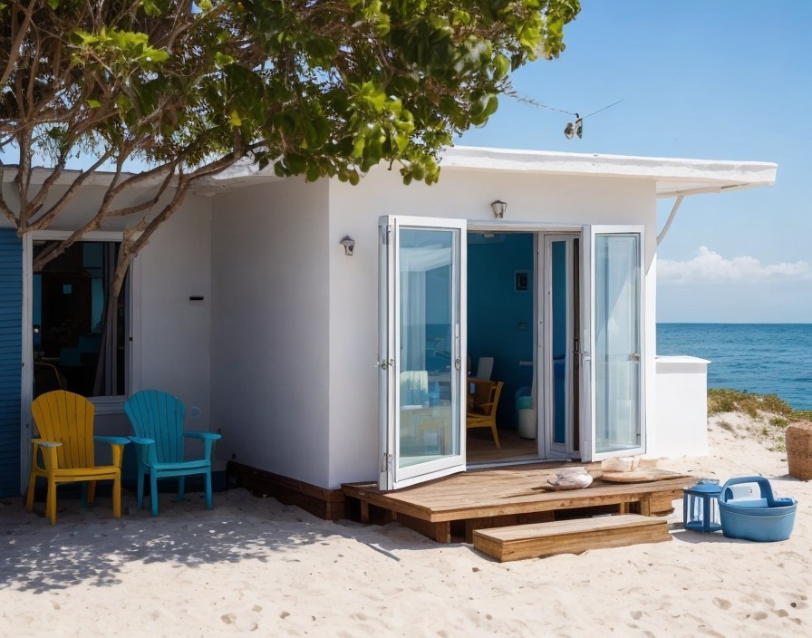 A small white beach house with blue chairs outside, beside a calm sea under a clear sky.