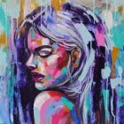 The image features a vibrant, abstract portrait of a woman with flowing hair. Her makeup is bold and colorful, with splashes of paint enhancing the energetic, artistic feel of the piece.