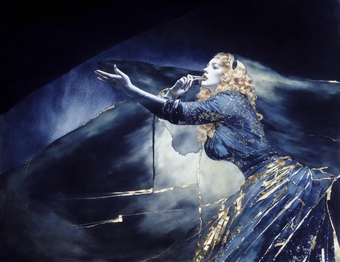 A woman in a flowing blue gown adorned with gold holds a small box, gazing thoughtfully into the distance against a dark, abstract background, evoking a sense of mystery and longing.