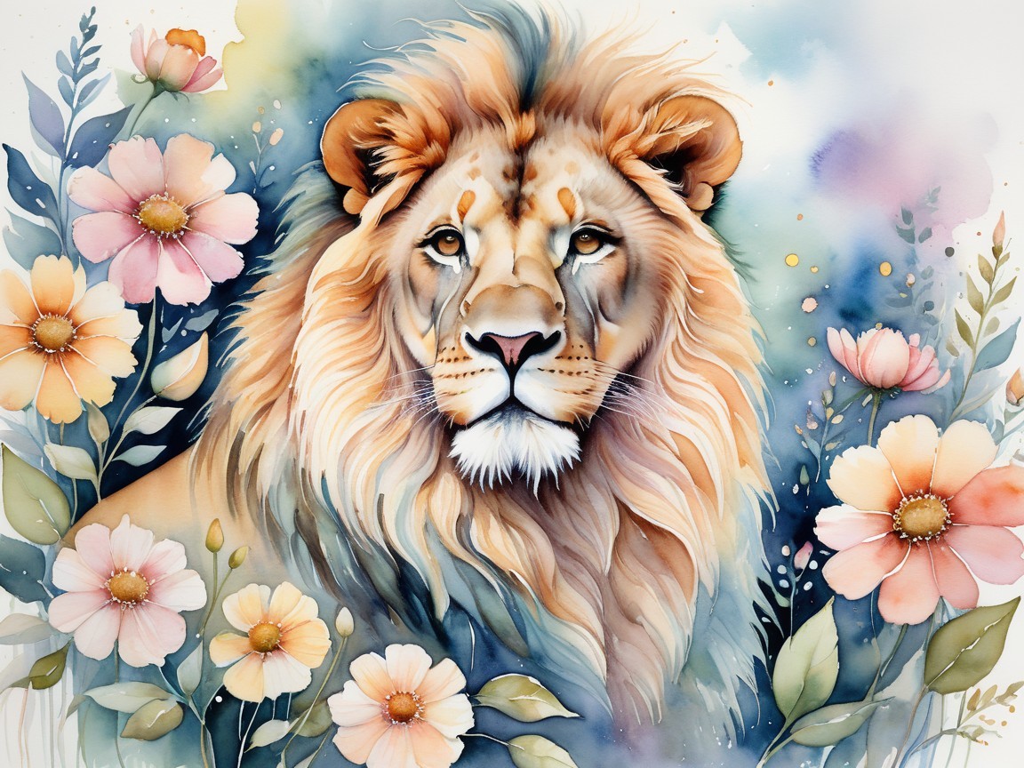 A serene woman with long, flowing silver hair adorned with a floral crown. Her striking blue eyes and delicate features complement the vibrant, colorful background of flowers.