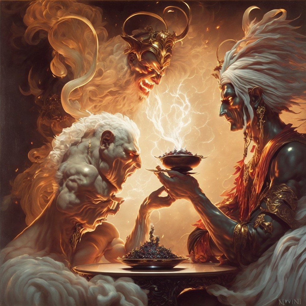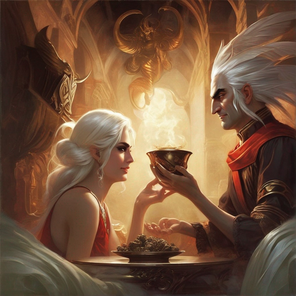 Two fantasy characters, one green-skinned and one pale, share a mystical-looking chalice in a golden-lit chamber with an arched window behind them.