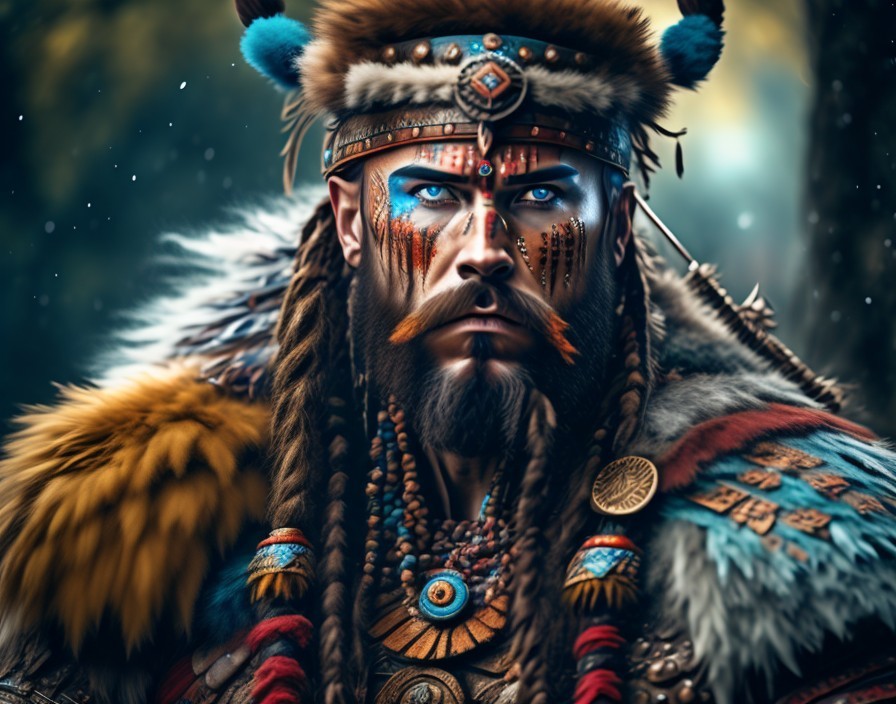 Digital Artwork of Man with Tribal Face Paint and Headdress