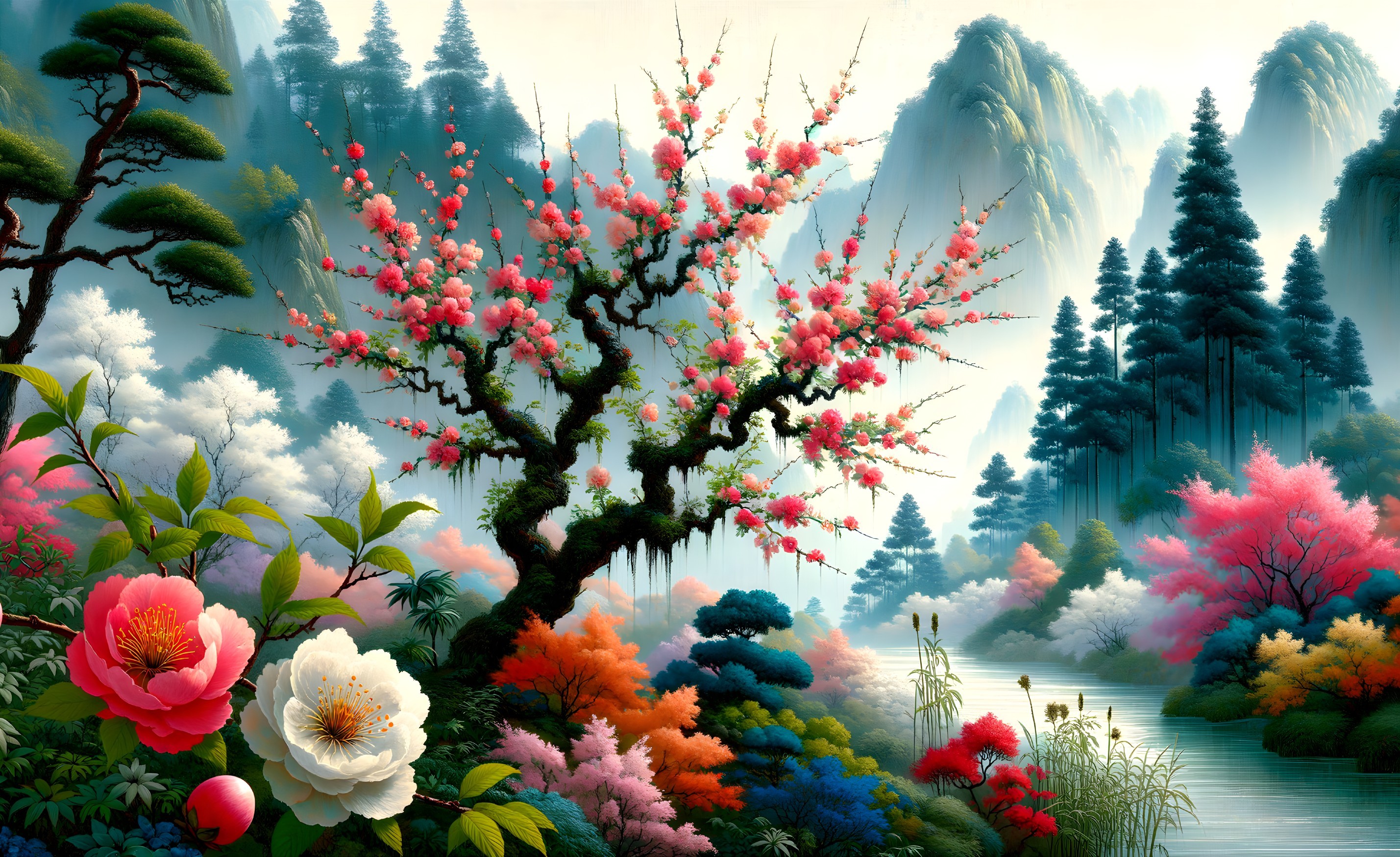 Experience a stunning 3D artwork featuring Japanese plum and peach trees in full bloom with a serene backdrop of misty mountains and tranquil waters. The vibrant blossoms, lush foliage, and detailed brushstrokes create a harmonious and peaceful ambiance, influenced by traditional Japanese art. This trending piece on Artstation showcases rich colors, expressive brushwork, and