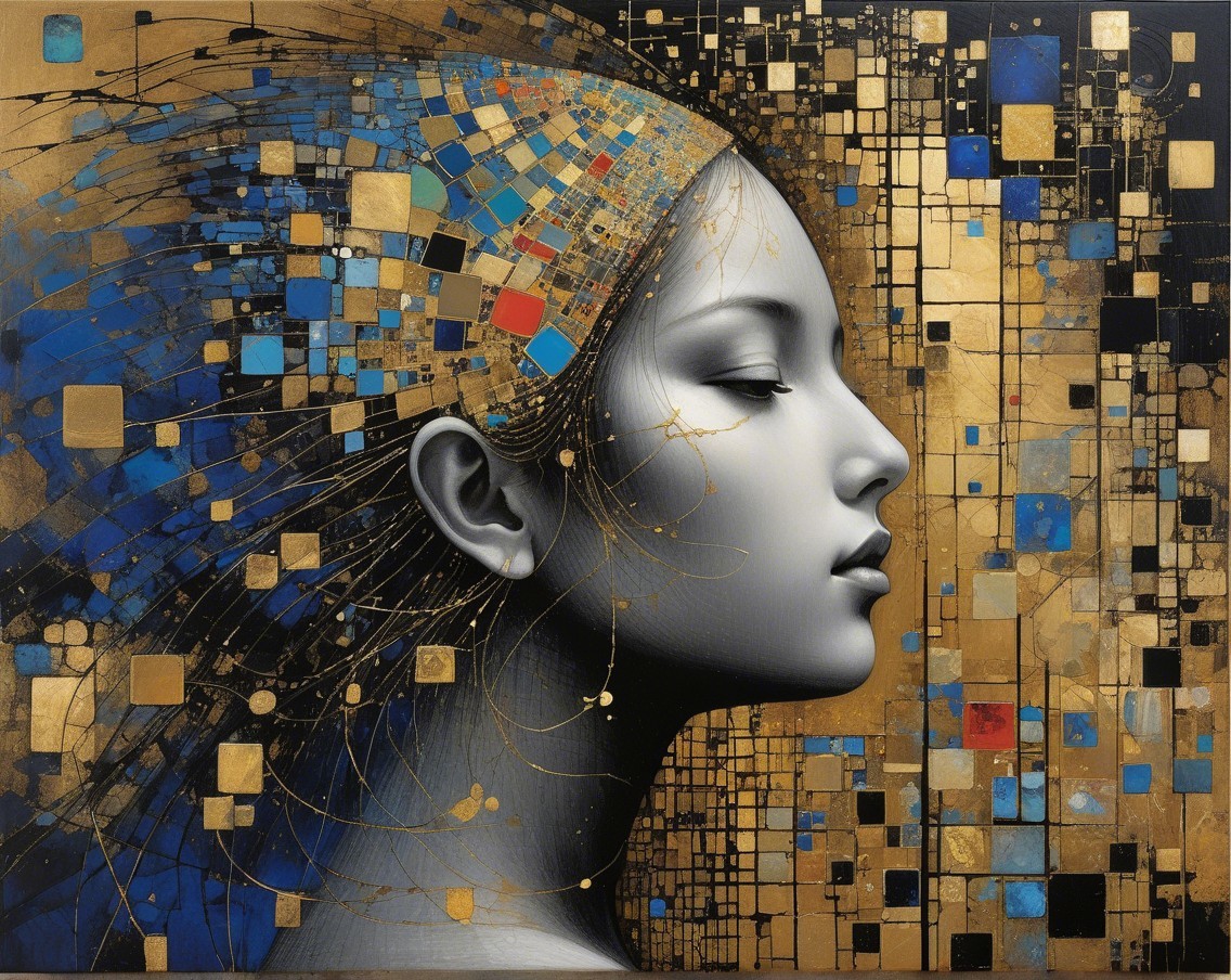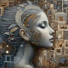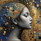 A serene, stylized profile of a woman adorned with a golden headdress featuring blue jewels. A small bird perches nearby, set against a backdrop of abstract shapes and muted colors.