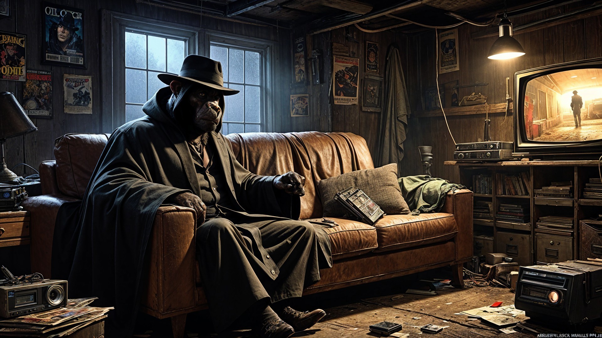 In a dimly lit, vintage room, a gorilla dressed in a black suit and hat sits on a worn couch, holding a pistol. Old posters and a flickering TV set the scene for a tense, noir atmosphere.