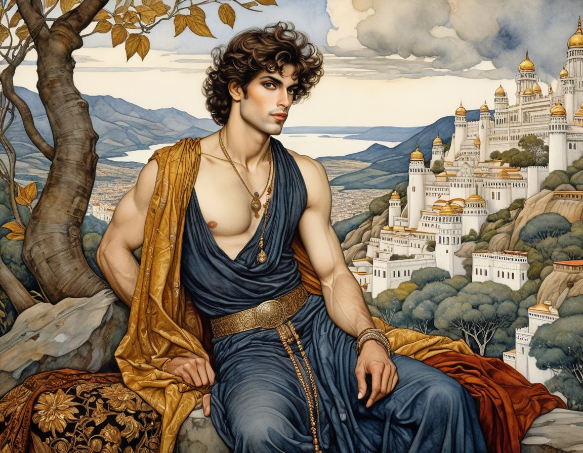 A young man with curly hair, dressed in a flowing blue robe and golden accents, poses beside a tranquil tiger. Majestic palaces and lush landscapes create a serene, exotic backdrop.