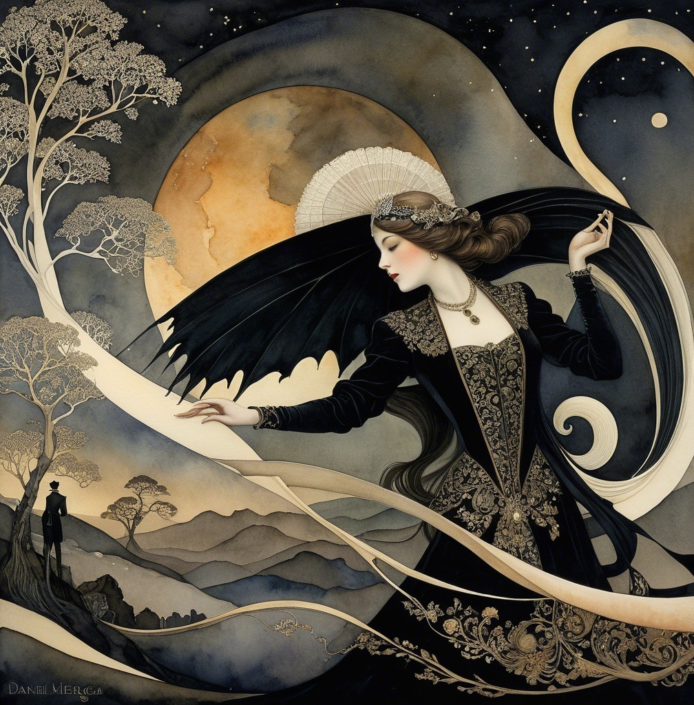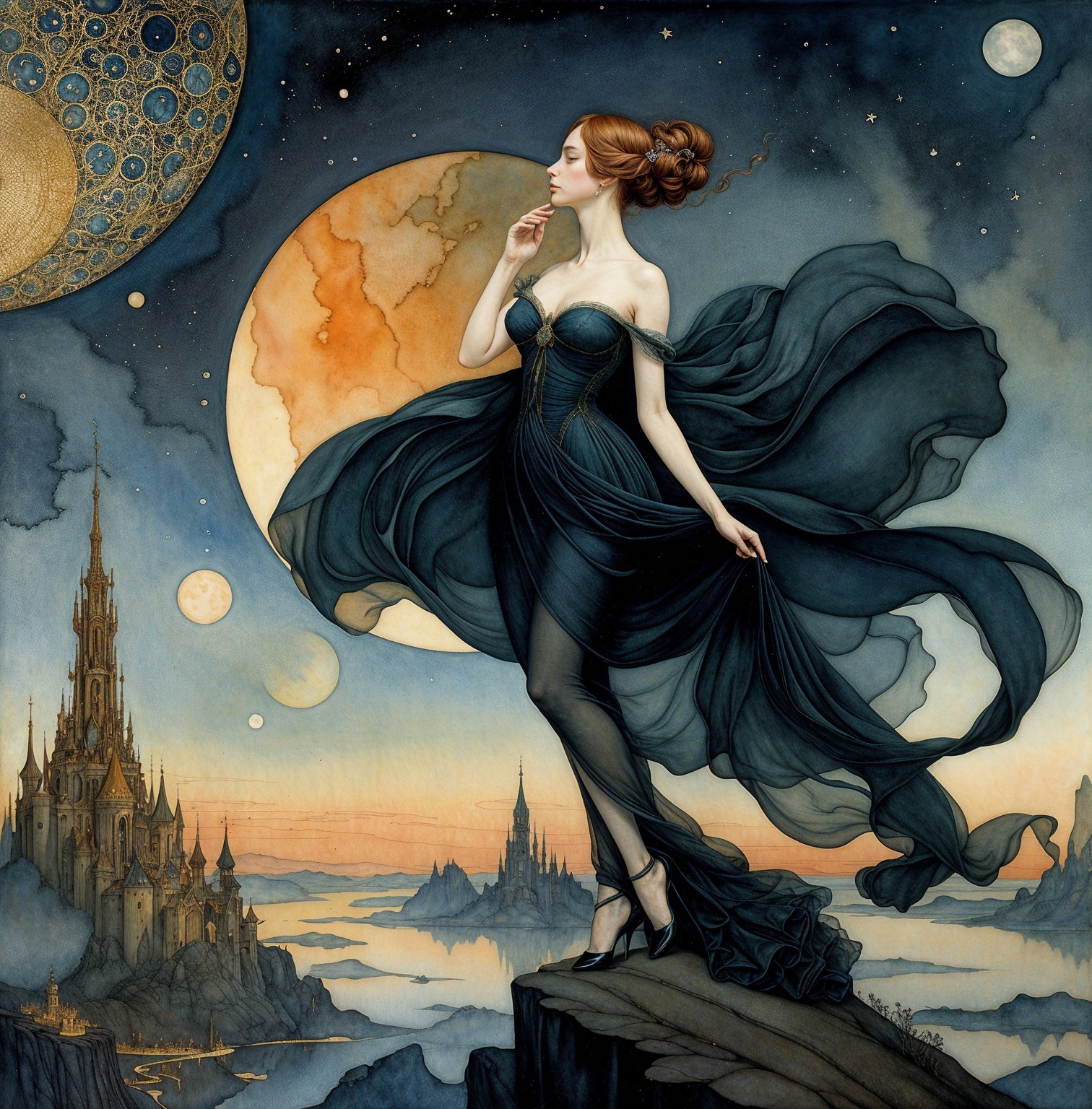 A majestic landscape featuring a towering castle on a mountaintop, a large tree silhouetted against a starlit sky, and multiple planets looming above, creating an enchanting, otherworldly scene.