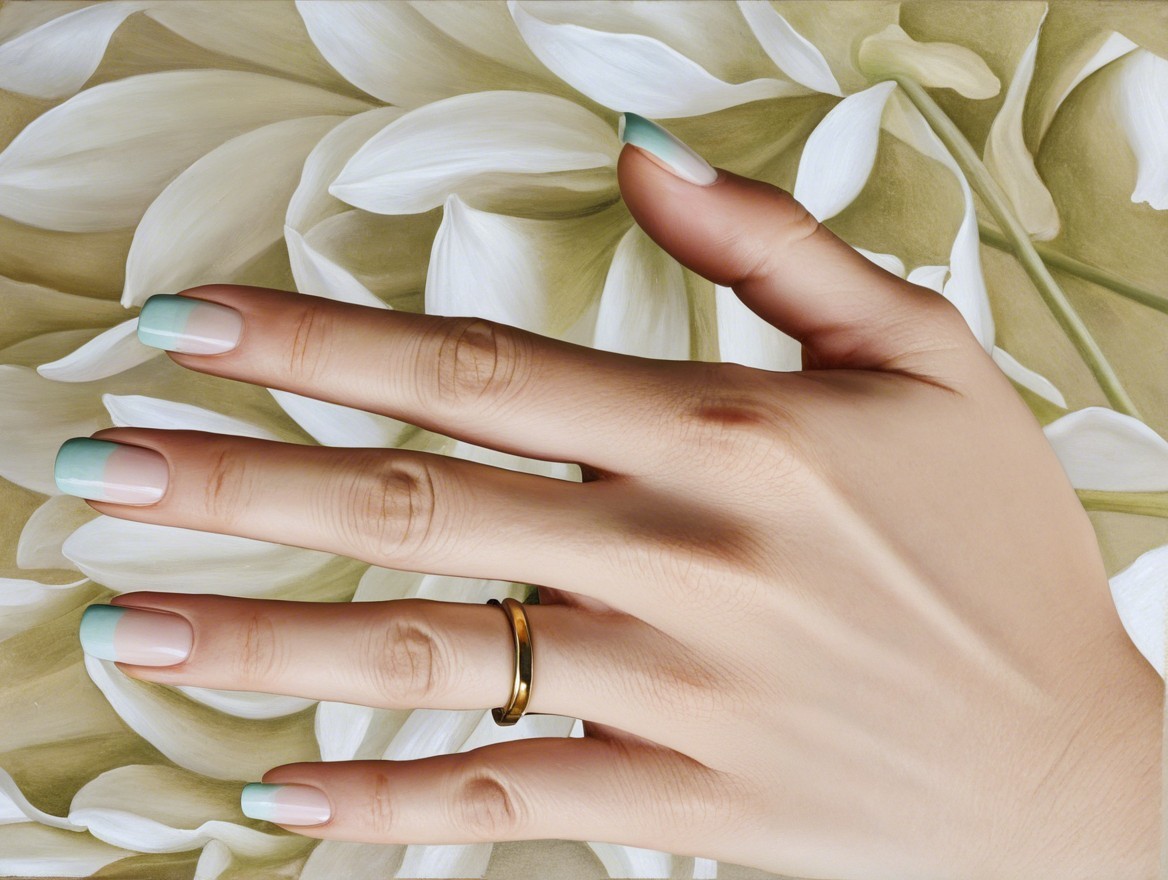 The image features a hand with elegantly manicured nails, showcasing a subtle nude base and mint green tips. A simple gold ring adorns the finger against a soft, patterned background.
