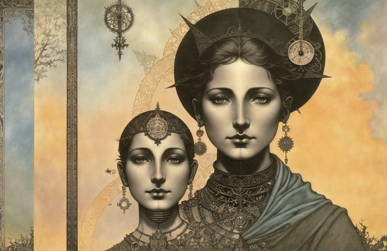 A girl in a vintage, steampunk-inspired outfit stands against a dreamy sky, surrounded by intricate gears and clockwork elements, blending beauty with mechanical artistry.