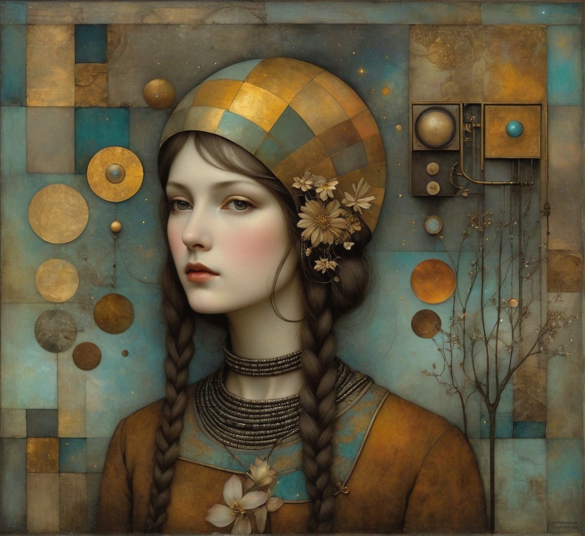 A serene portrait of a young woman with braided hair, adorned with flowers and a golden halo, set against a cosmic background featuring clocks and celestial elements, evoking a sense of wonder.