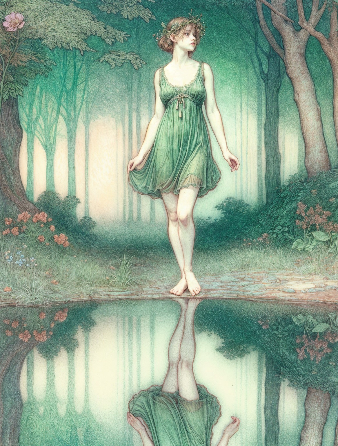 A serene scene featuring a woman in a flowing green dress standing by a calm pond, surrounded by lush trees. She gazes at her reflection, evoking a sense of tranquility and enchantment.