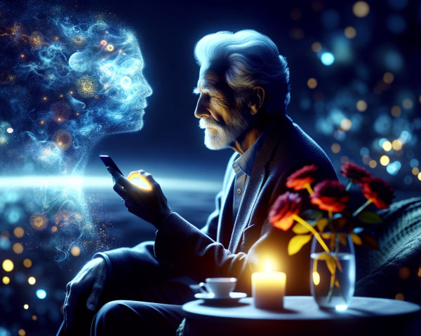 Prompt: A high-resolution digital image in the style of realism with elements of visual art that seek to be photorealistic using the technique of «Silhouette in silhouette» (or double effect) to convey the idea of dualism. The image presents a deeply melancholic and poetic scene, revealing the theme of memories, dreams and absence of a close person. In the center of the composition is an elderly man about 60 years old with a tired but surprisingly noble face sitting on a bed in a dimly lit room. The man has very short semi-gray hair: the haircut «semi-boxing/ boxing» is a classic military choice and a short semi-gray beard, without a mustache, which gives his appearance maturity and thoughtfulness. His short semi-grey hair on the head, on the temples and a very short semi-grey beard gives off serious facial features. The man has very short white hair: the haircut «semi-boxing/ boxing» is a classic military choice and a short gray beard, without a mustache, which gives his appearance maturity and thoughtfulness. The man holds a smartphone in his hands, but his gaze is directed far away; his posture and facial expression express deep reflection, perhaps melancholy or immersion in memories. One hand supports the chin, enhancing a sense of focus on inner experiences. The room is immersed in a twilight, illuminated only by several sources of light that create a mystical atmosphere. Next to the bed is a small bedside table, on which burning candle, radiating heat, living flame. Next to the candle in the vase stands a lush bouquet of bright red roses, their petals look fresh and velvety, adding a bright color accent to the otherwise muted palette. These roses may symbolize love, passion or lost feelings. Above the head of a man, as if woven from light and mist, is a translucent, ghostly silhouette of a woman. It is executed in neon blue tones, creating a sense of unreality, but at the same time its presence is palpable. Apparently, it’s his wife. Her figure gently leaned over the man, expressing concern, memory or invisible connection. Light clouds of smoke or mist emanate from her figure, which emphasizes her ephemerity as if she were only a memory, a dream or some spiritual presence. In the background, at the top of the image, you can see the elements of the night sky: a crescent, several twinkling stars and silhouettes of flying butterflies that look like sparks of light. These details add even more magic and romance to the scene. The image should incorporate High Dynamic Range (‘Super HDR’) techniques to emphasise and convey the amazing beauty of these natural elements in vivid detail. Add super detail and super clarity to this image. Remove extraneous noise and unnecessary elements from this image. Outstanding visual art, masterpiece, trending on ArtStation, Unreal Engine 5, IMAX Cinematic, OLED 8K, photorealistic CGI and VFX by WetA_Digital, HDR and QUANTUM DOT technology for natural colors and sharp details. Smart 4K UHD QLED where flawless 4K clarity meets intelligent Ai Opticolor.