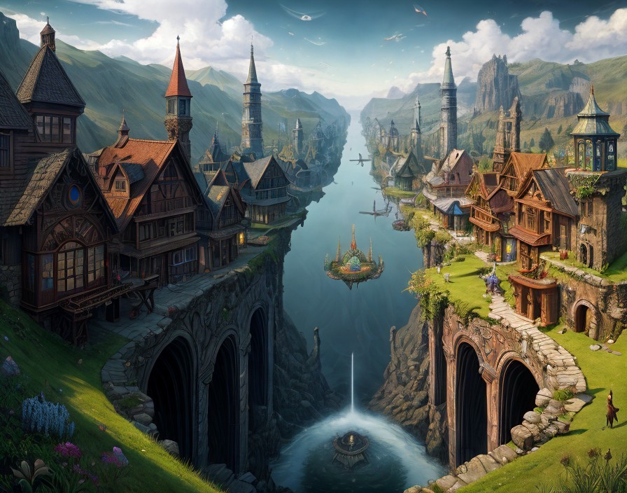Fantasy city with mirror-image halves, medieval buildings, floating islands, and a mysterious orb at the center dividing both sides.