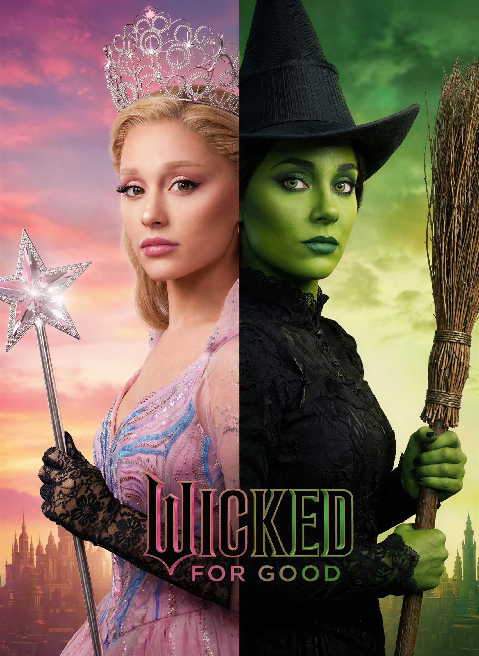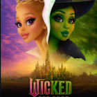 A split screen movie poster for Wicked, a musical, showing young Glinda on the left and Elphaba on the right. Glinda has blonde hair, an ornate crown, pink glossy lipstick, long eyelashes, and holds a shining star scepter in a black lace glove while wearing a pink glitter