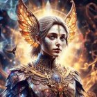 Create an ethereal character portrait of a young woman with stunning, ornate wings made of shimmering gold and intricate patterns. Her hair is silvery-blonde and elegantly styled, complementing her mystical appearance. She wears a detailed, ornate armor adorned with gemstones and intricate designs, reflecting a blend of fantasy and elegance. The background is filled with swirling magical energies and soft light, creating a celestial atmosphere. Add delicate butterfly motifs fluttering around her to enhance the enchanting vibe.