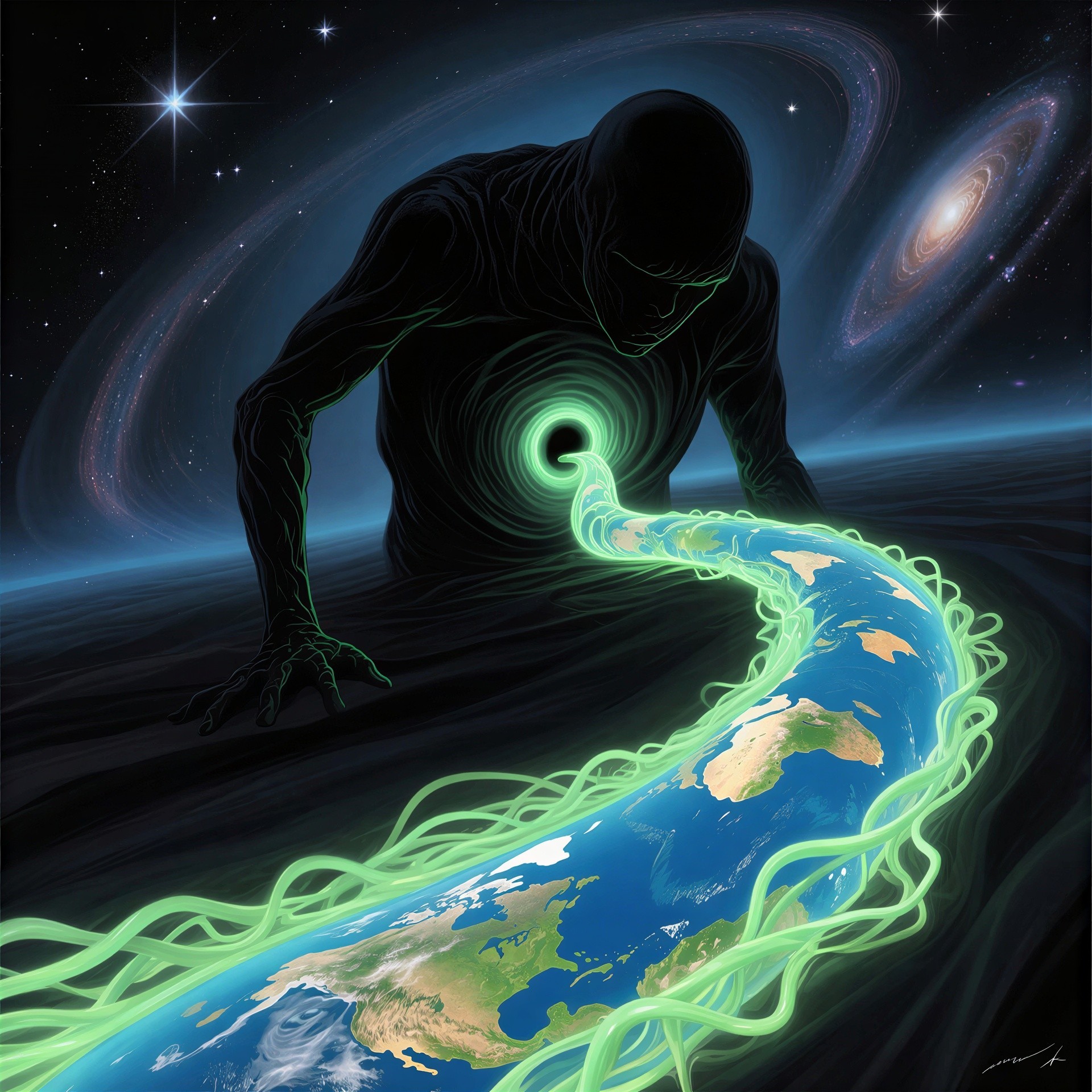 A dark, featureless humanoid figure with bright green glowing outlines and a spiraling vortex black hole in its chest, is seen bending over a flat plane of dark matter in space. From the vortex, a glowing green wormhole-like tube extends downwards, revealing a detailed depiction of Earth's surface