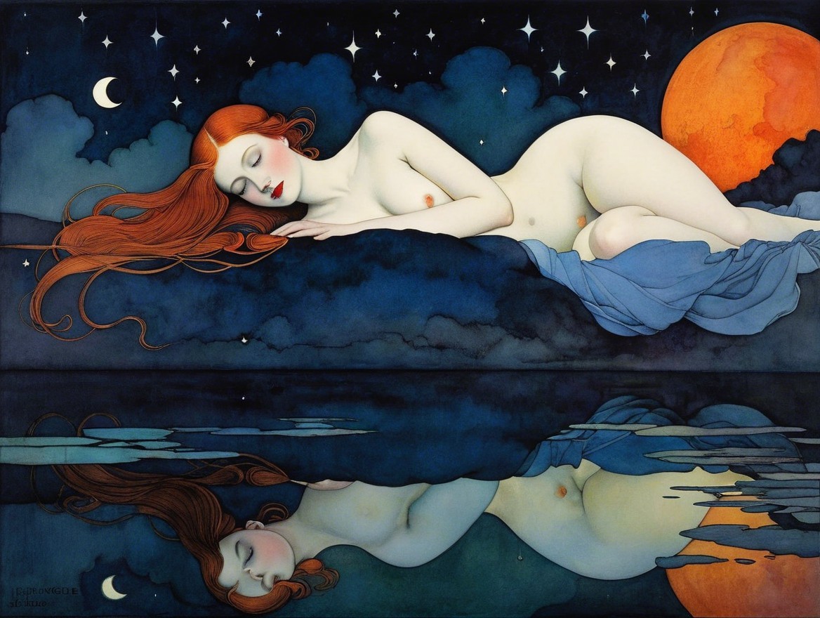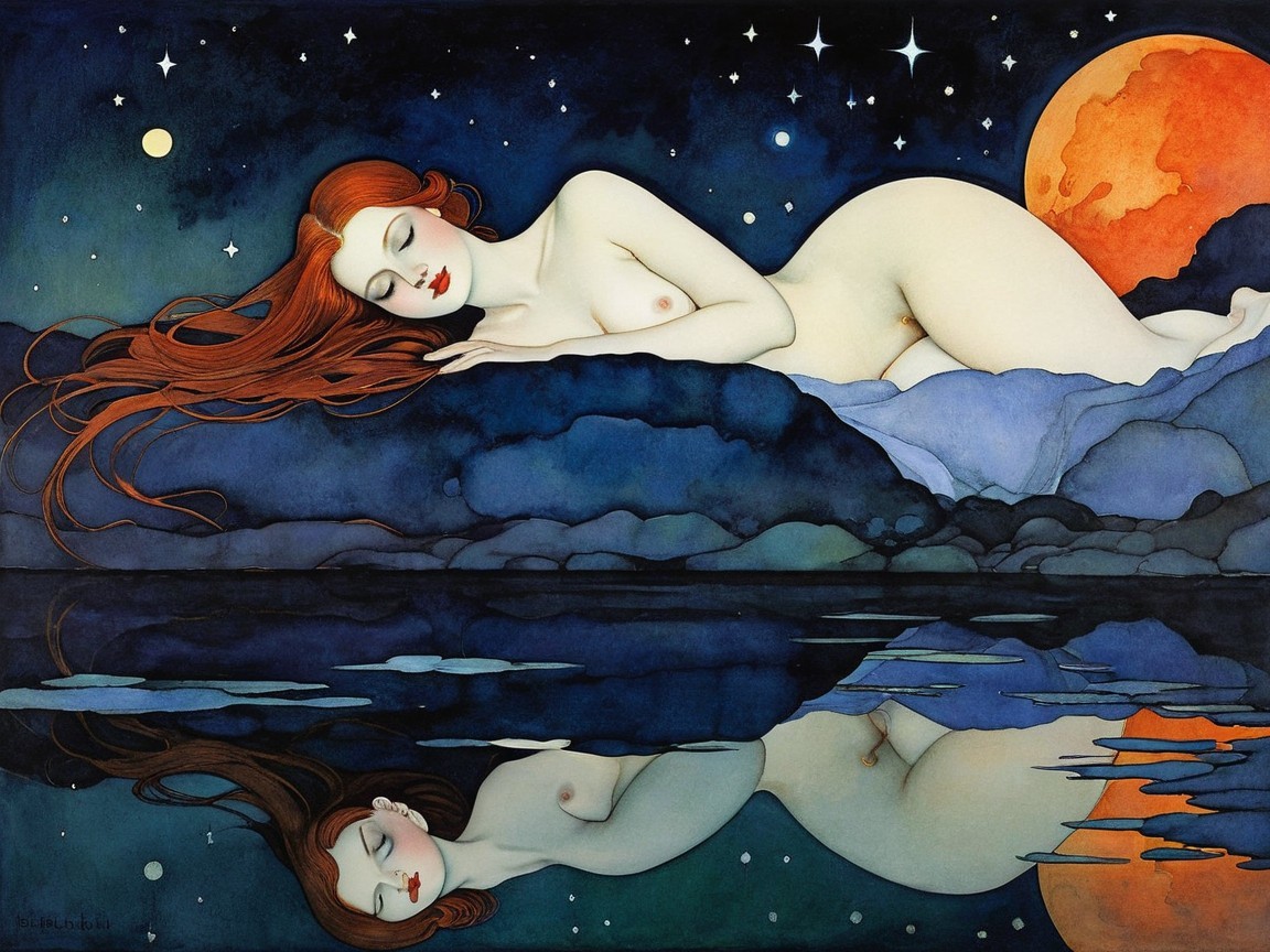 The painting depicts a serene, nude figure with flowing red hair, resting on a rock by a moonlit water. A large, glowing moon and stars create a tranquil, dreamlike atmosphere.
