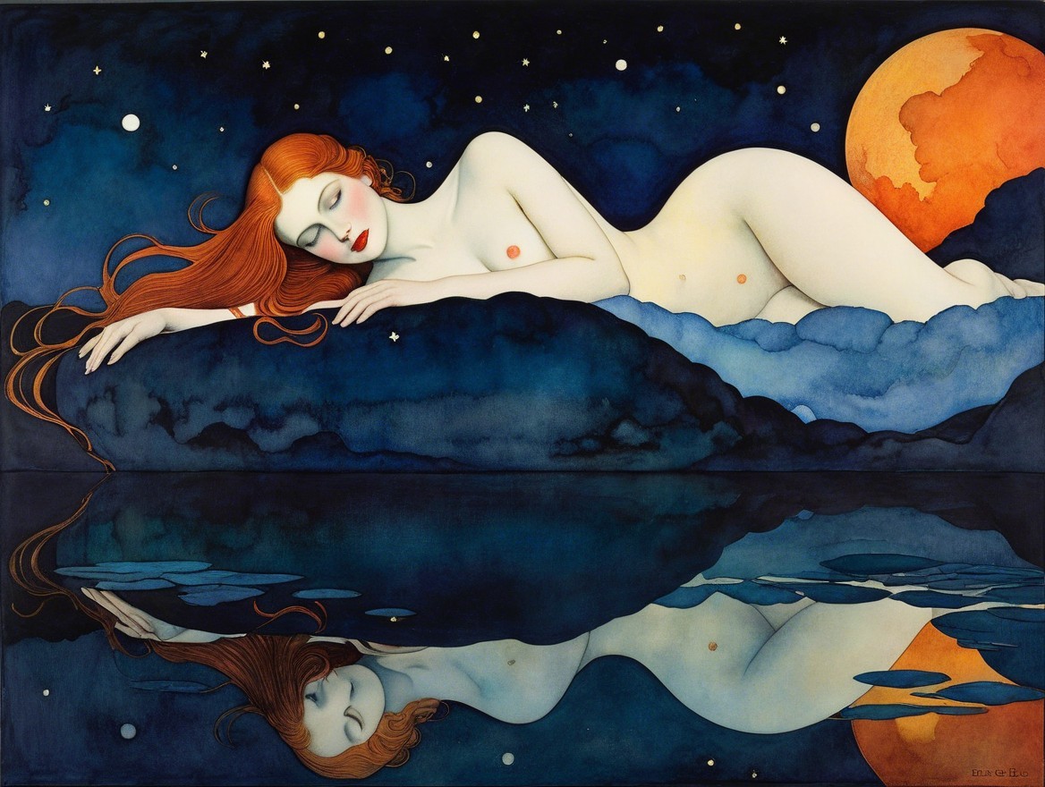 Nude Woman with Red Hair in Ethereal Night Landscape