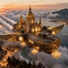 A magnificent airship adorned with intricate golden details and chandeliers soars above a serene landscape, floating amidst clouds at sunset, casting reflections on a tranquil lake below.
