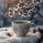 A delicate porcelain cup adorned with floral patterns sits on a snowy table, surrounded by snow-covered branches. The sun sets in the background, creating a warm, golden glow.