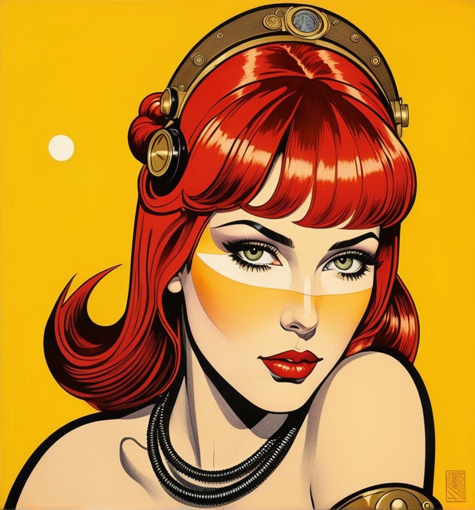 Prompt: Stylized woodblock print, Comic book art merged with abstract art and storybook illustration, reminiscent of steampunk, Handsome serene temptress with devilish eyes and curly hair, romantic abstraction, Dark gothic ambiance, contouring lines of Dejah Thoris and patrick nagel, academical Style, groovy, Sensual, eroticism, hues by Overton Loyd and edward Hopper, line-art hairstyle with 3D texture brushlines; zentangle patterns, warm colours of orange black orange and red,.multi-layered style; cel-shaded, uhd, hdr, hues in pale orange and soft yellow, tints in style by Georgia o'keffee and Overton Loyd, composition in space age style, stacked-up perspective, detailed line drawing on satin, stacked lines, marvel comics art, style of Georgia O'Keefe, Jackson guice, Geof Darrow, harrison fisher, William Turner, Patrick Nagel and Overton Loyd, Art Nouveau details by barclay shaw, fauvistic, bold lineage illustration, wide angle, brass, grain, metallic details in lineage in black ink, fancy, moody, stylized modern collage illustration merged with abstract art, stylized lighting from top to centre, divisionism, small circles, grunge, anisotropic filtering 1.7, shadow mapping 1.3, minimalistic, simplified plasticity 1.3, beautiful marvel comic book character, orange to beige color palette, 1950s space age style by Curtis Cole, close-up, 3 layers of dof, traumacore 1.2, octane render illustration,, comic book art, plasticity 1.3, octane render, uhd, hdr, high coloring, brightness 1.9, ambient occlusion 1.5,raytraced shadows 1.8Quulling, quaint, cel-shaded,overall stylized illustration by Chris Foss and Overton Lloyd and barclay shaw and Susan Seddon Boulet