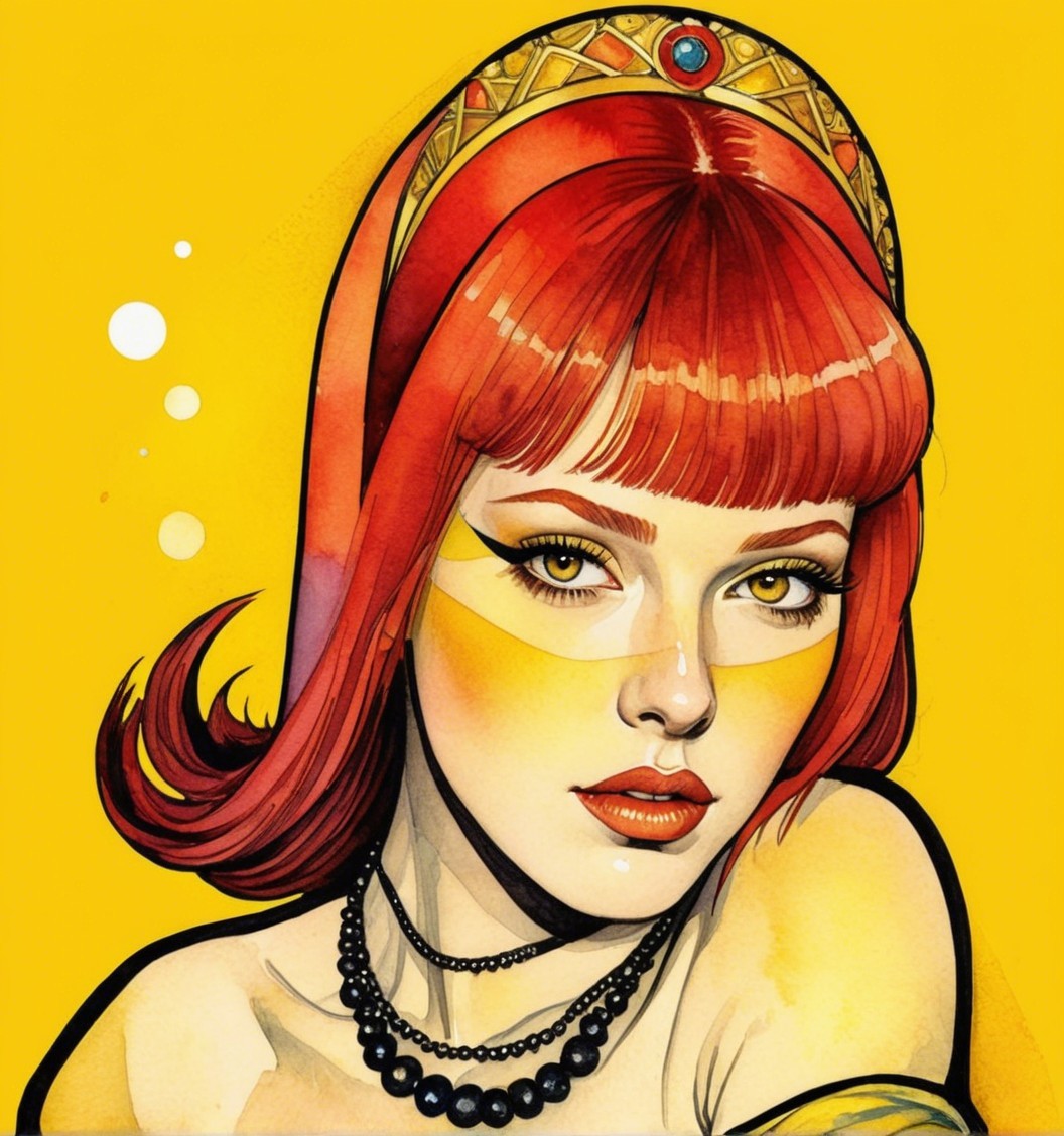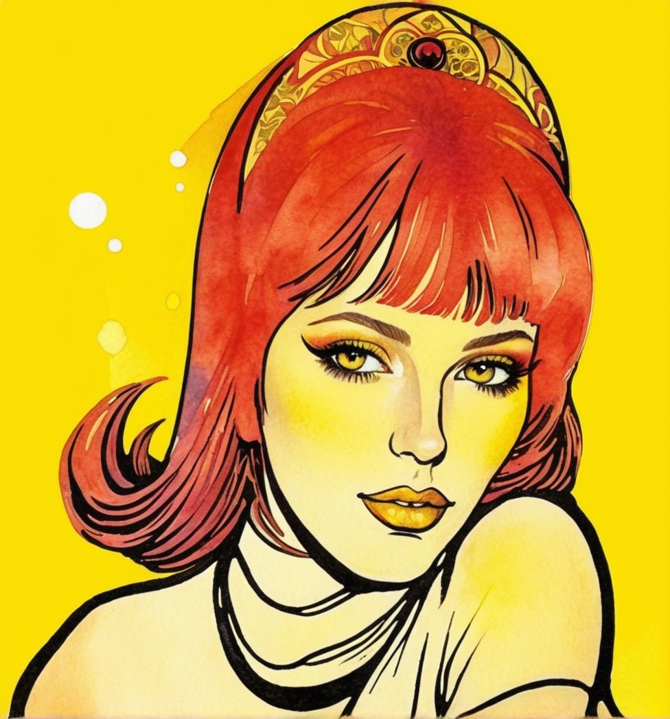 + Prompt:Renaissance portrait, upper body portrait of beautiful temptress with red hairbangsandlong eyelashes, light reflections, yellow hues, Watercolor details, inkpunk 1.3, golden ratio, fractal line drawing with watercolor elements, outline illustration blended with realism and fractalization, watercolor and ink style with zentangle det, comic book art 1.7, 1970s fantasy art merged with pop art, otherworldliness, joy, gouache, detailed orange strokes in background drawn with pen and ink, earth tones, sepia colors, thick raised impasto, style of Margaret Keane and Didier Lourenço and barclay shaw and John Berkey, detailed drawing, radiance, divisionism, baroque, vector 9:5, detailed, physically based, cottagegore details, fauvistic, 1960s fantasy art, retropunk, sculpted, blur, 3 layers in logarithmic distance with DOF, occult, american gothic 1.7, stylized collar with thin flowing fabric, romantic abstraction, triadic color scheme orange yellow beige, comical, background in style of Margaret Keane and Megan Duncanson and Overton Loyd, brightness 1.4,, intricate stylized hair, devilish eyes, raytraced shadows 1.2, diffused lighting rimming the occult quality of the depiction, highlighted with muted tones of bright orange, light yellow, 3d effects, tuny strokes, anisotropic filtering 1.2, shadow mapping 1.1, wavery texture, dynamic lighting 1.2, complexion 1.2, radiance, illustrative stylization, grain,very eerie and fantastical place, folded paper style 1.9, stylized artwork, plasticity 1.9, beautiful composition 1.9, refraction in eyes, hdr, symmetrical face, sculpted, Subdued palette,Symmetrical nose and mouth, moody, somber, desaturated coloring, delicate Soft dappled lighting. Golden hour. Quulling, quaint, cel-shaded,overall stylized illustration by Chris Foss and Overton Lloyd and barclay shaw and Susan Seddon Boulet