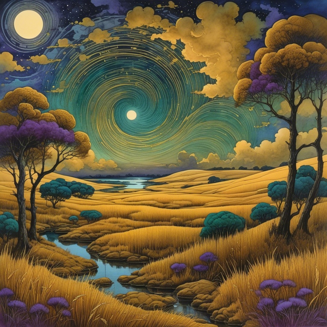A surreal landscape features flowing rivers and rolling fields under a vibrant night sky. A swirling vortex of stars and clouds is illuminated by a glowing moon, creating a mystical atmosphere.