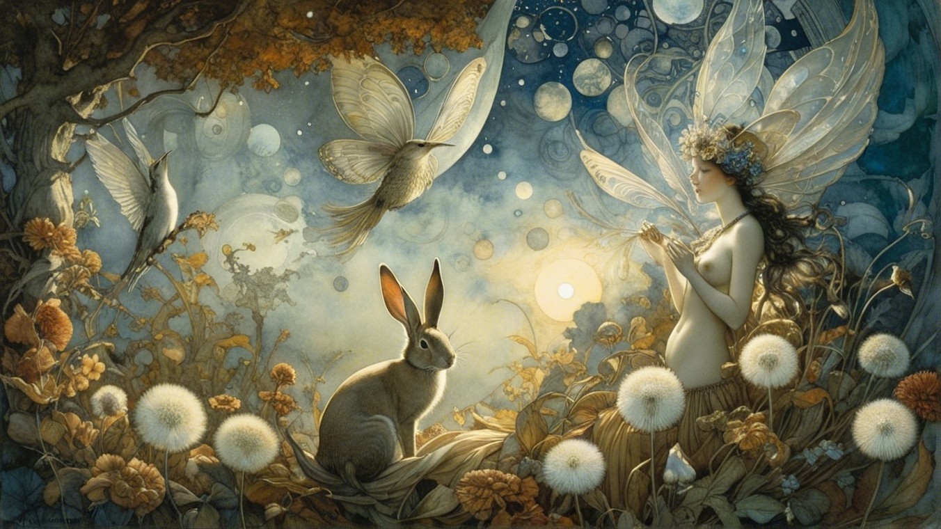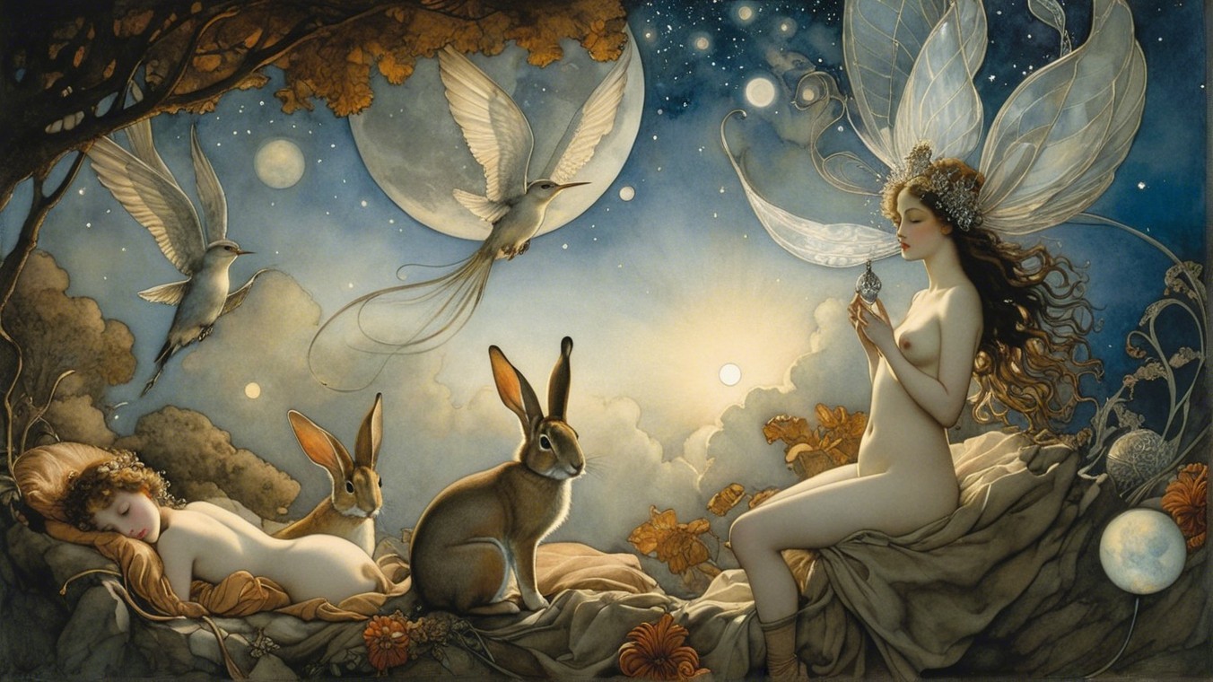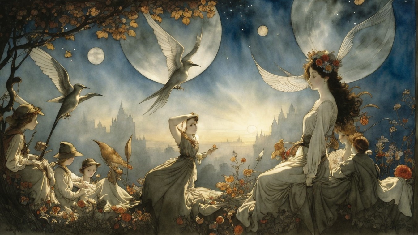 The image features ethereal figures, including women and children, set against a mystical twilight landscape with large moons, birds in flight, and a serene castle silhouette in the background.