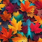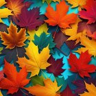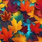 A vibrant collection of autumn leaves in various shades of red, orange, yellow, and green, arranged against a soft blue background, creating a rich and colorful fall vibe.