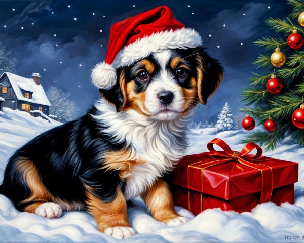 A regal dog wearing a top hat and an elegant coat sits in a snowy landscape, with a vintage town and a glistening ice cube in the background, exuding charm and nobility.