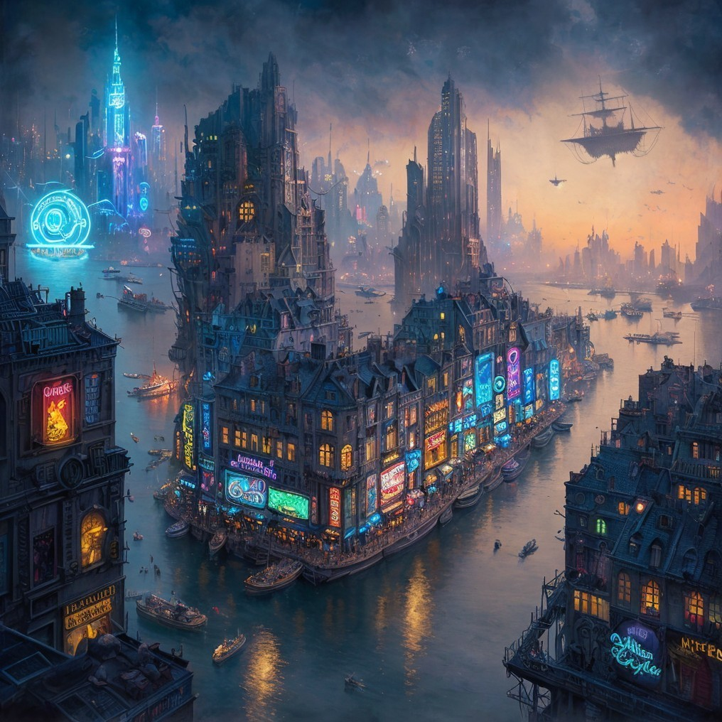 (ENG) This is the metropolis of Arkpolis. Civilization ruled by magicians with artificial bodies called Golemen, it is the most advanced and richest place on the entire continent, dominating the market and alchemy thanks to its Spiritual Metal formula (Metal Animae). Here we can see some of the commercial districts and the numerous canals that serve to link the Central Sea with the Dragon Flight Sea.